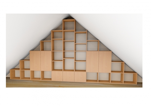Nutzen Sie die Wand unter der Dachschräge mit Hilfe der unterschiedlichen Regalwangenhöhen effektiv aus.Auch hier können Sie Rückwände und Türen einsetzen.
